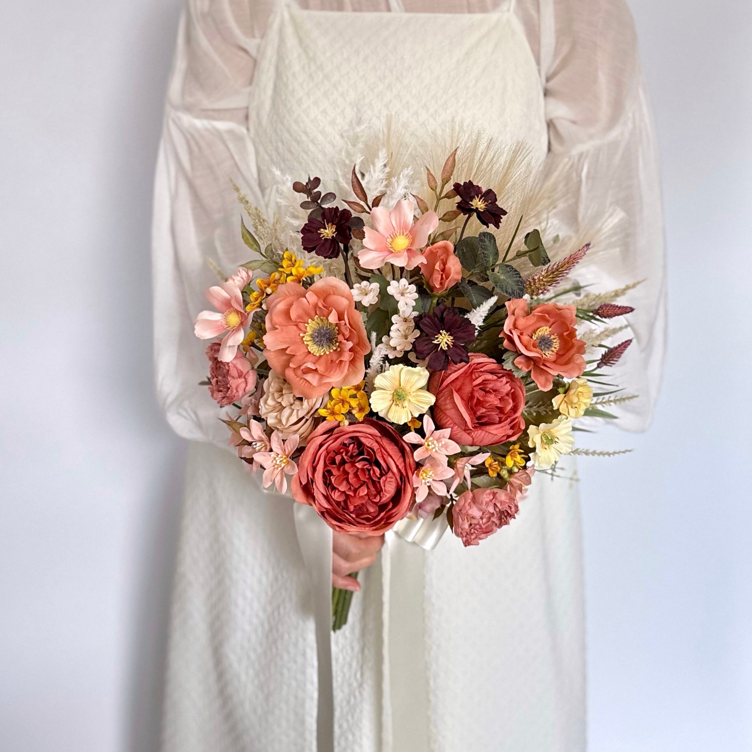 ピーチ・ライトイエロー・チョコレートのコスモス、さまざまな小花を散りばめて、ナチュラルな雰囲気に♪