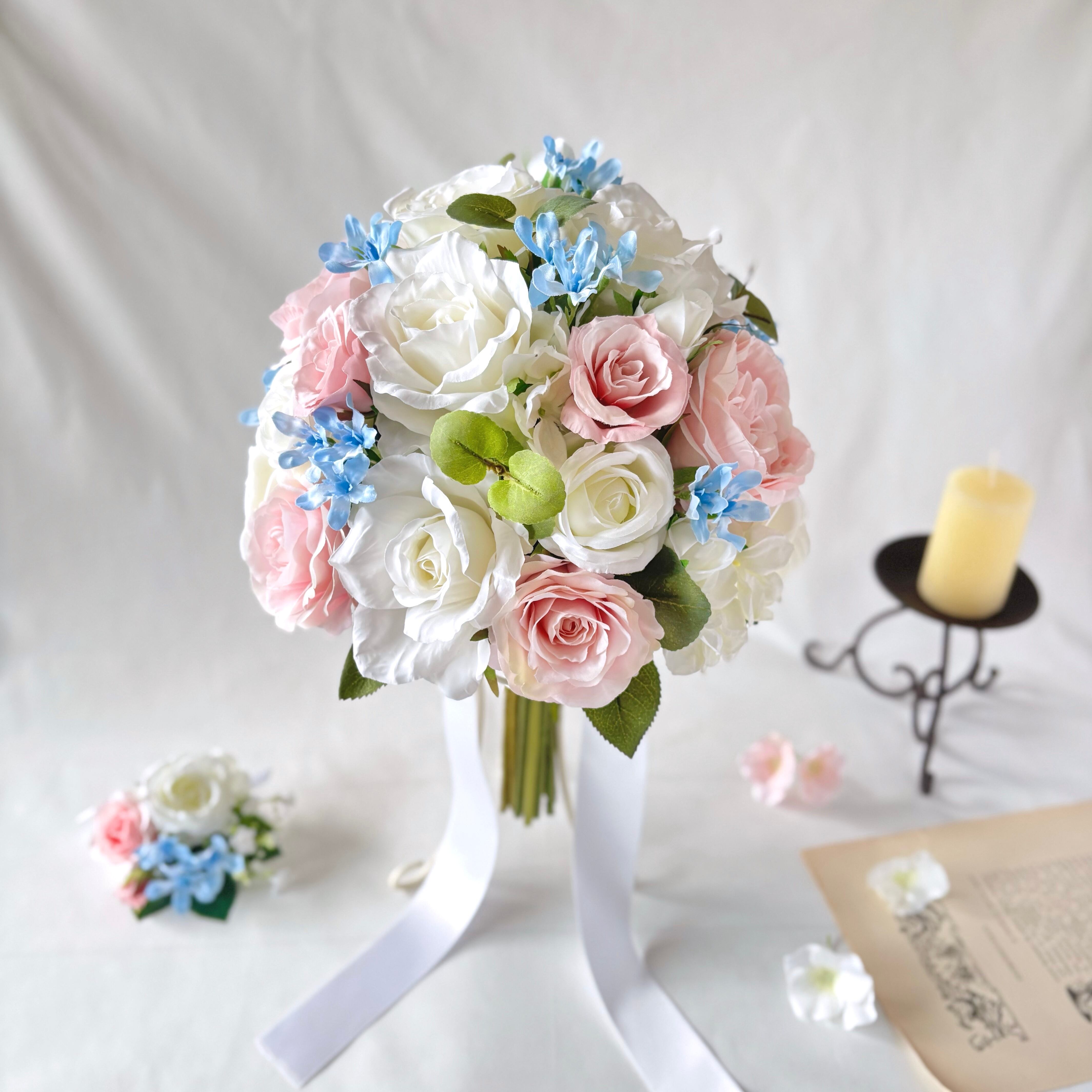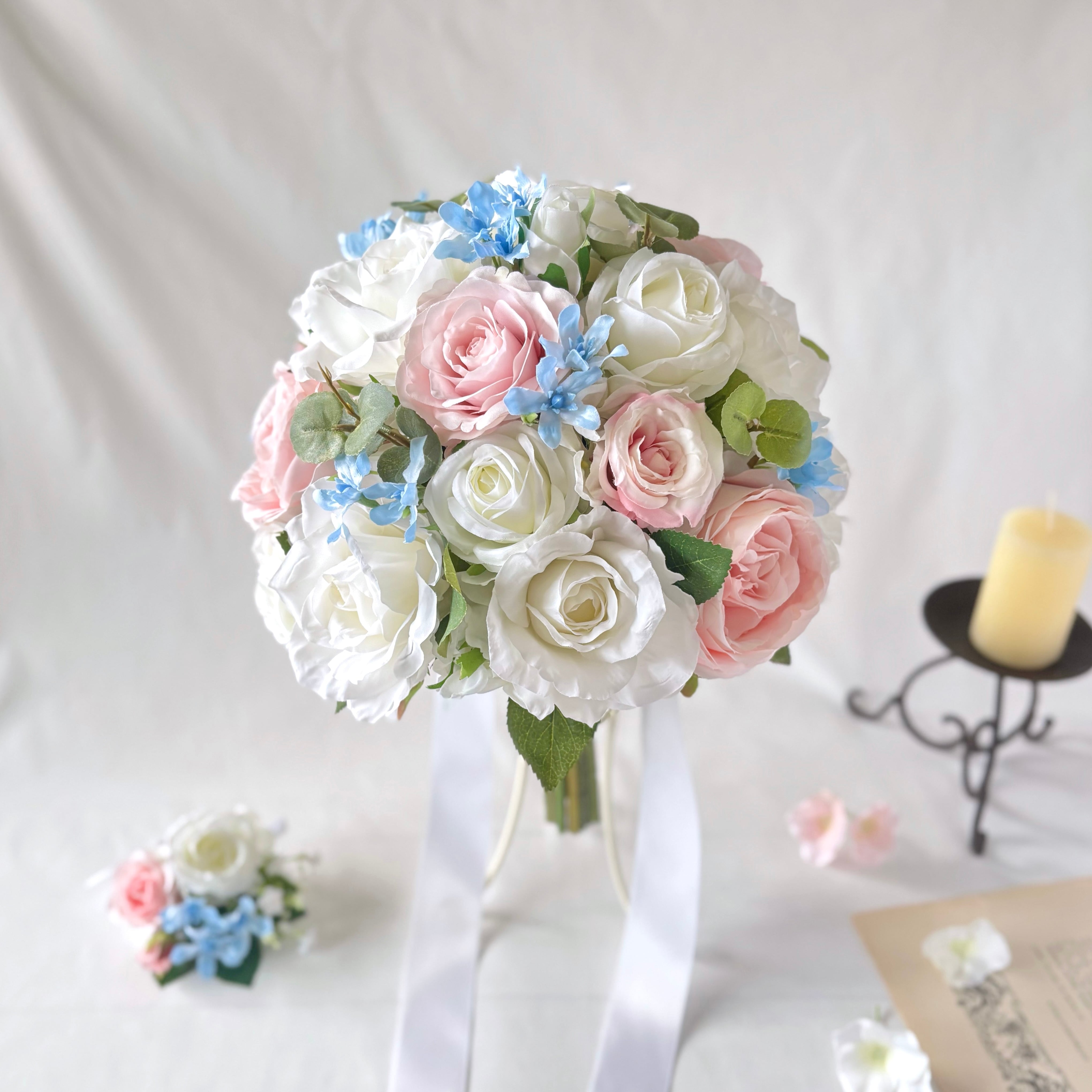 上品な色合いの中に淡い水色のブルースター、グリーンのユーカリなどのリーフを散りばめます♪