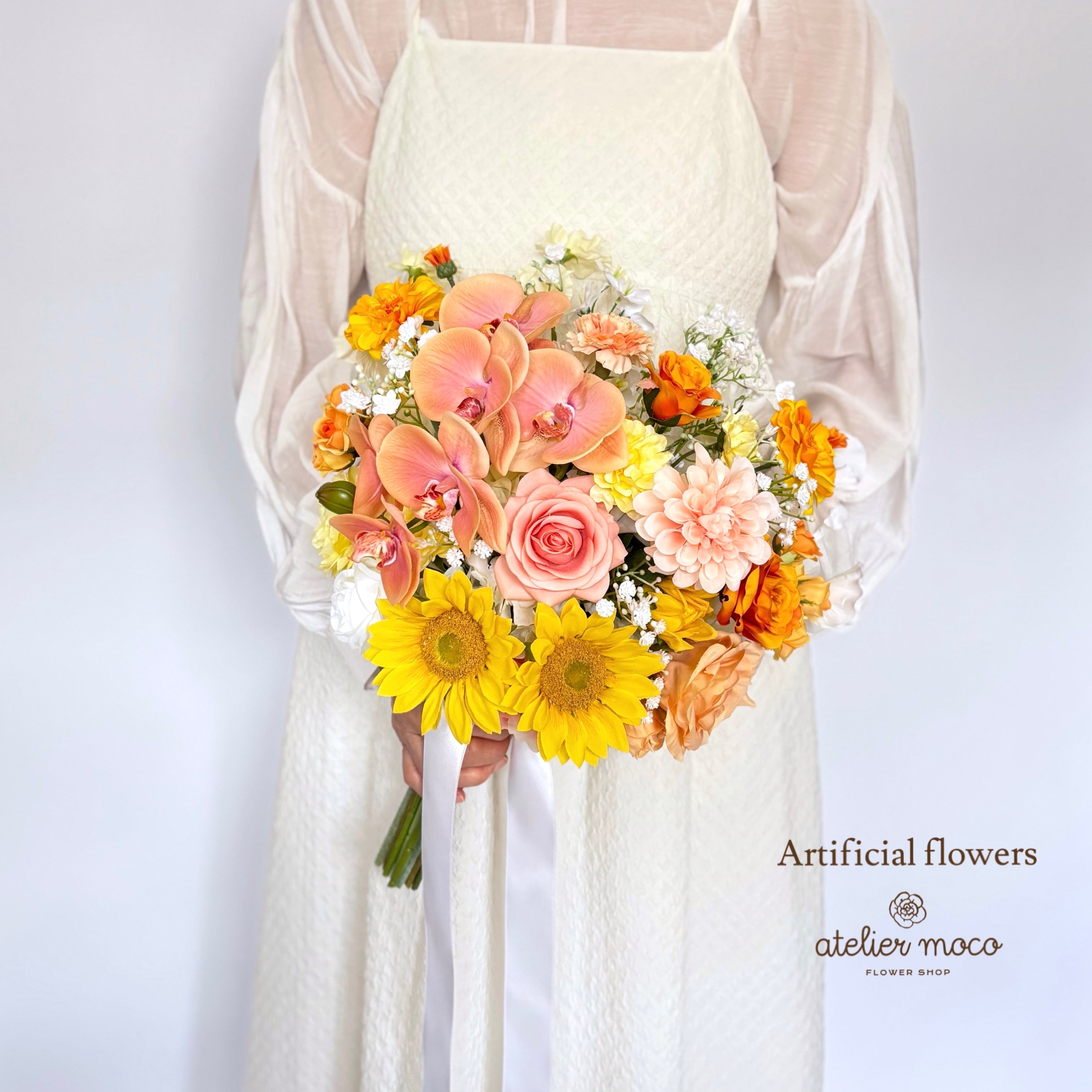黄色のひまわりとアプリコットの胡蝶蘭を使ったクラッチブーケです。