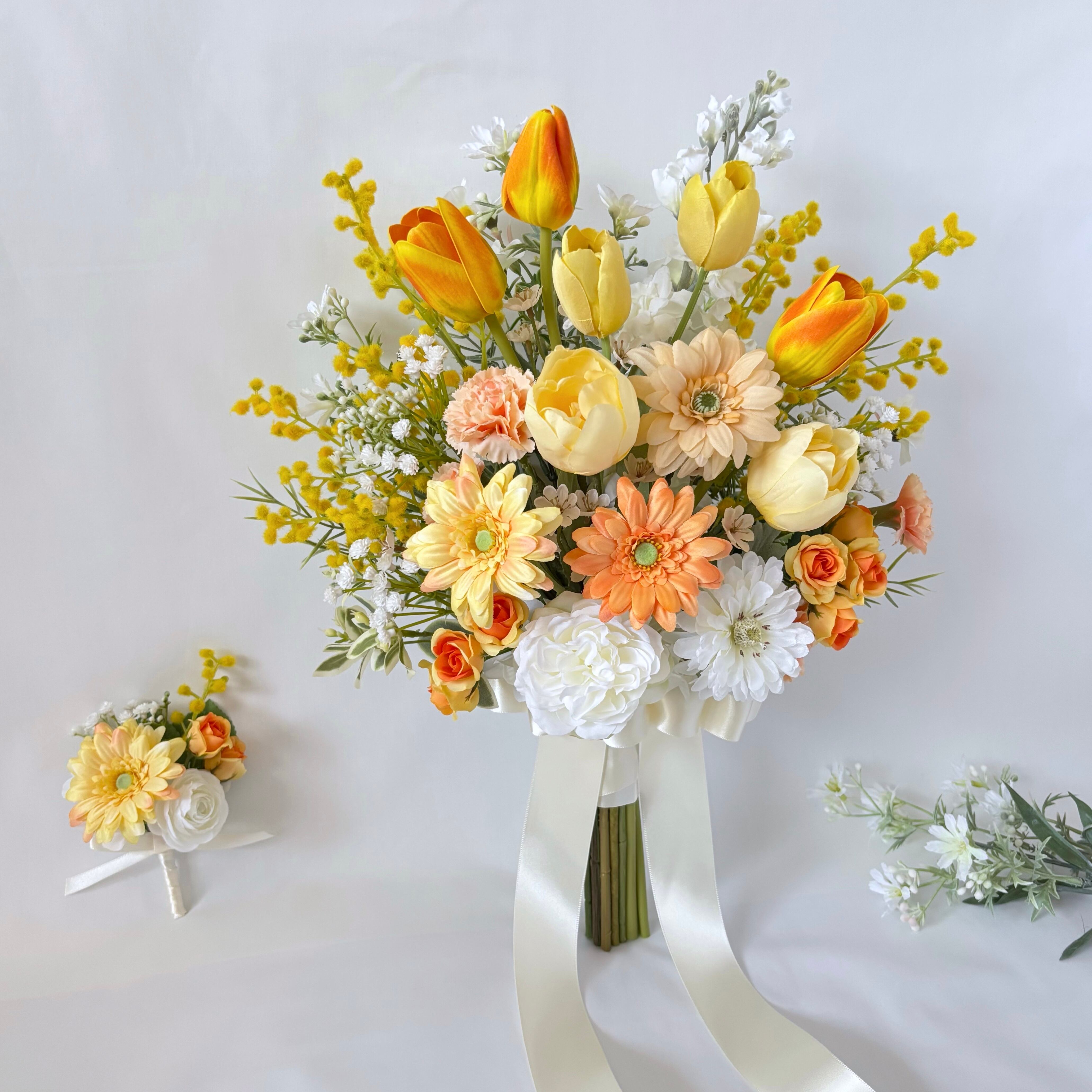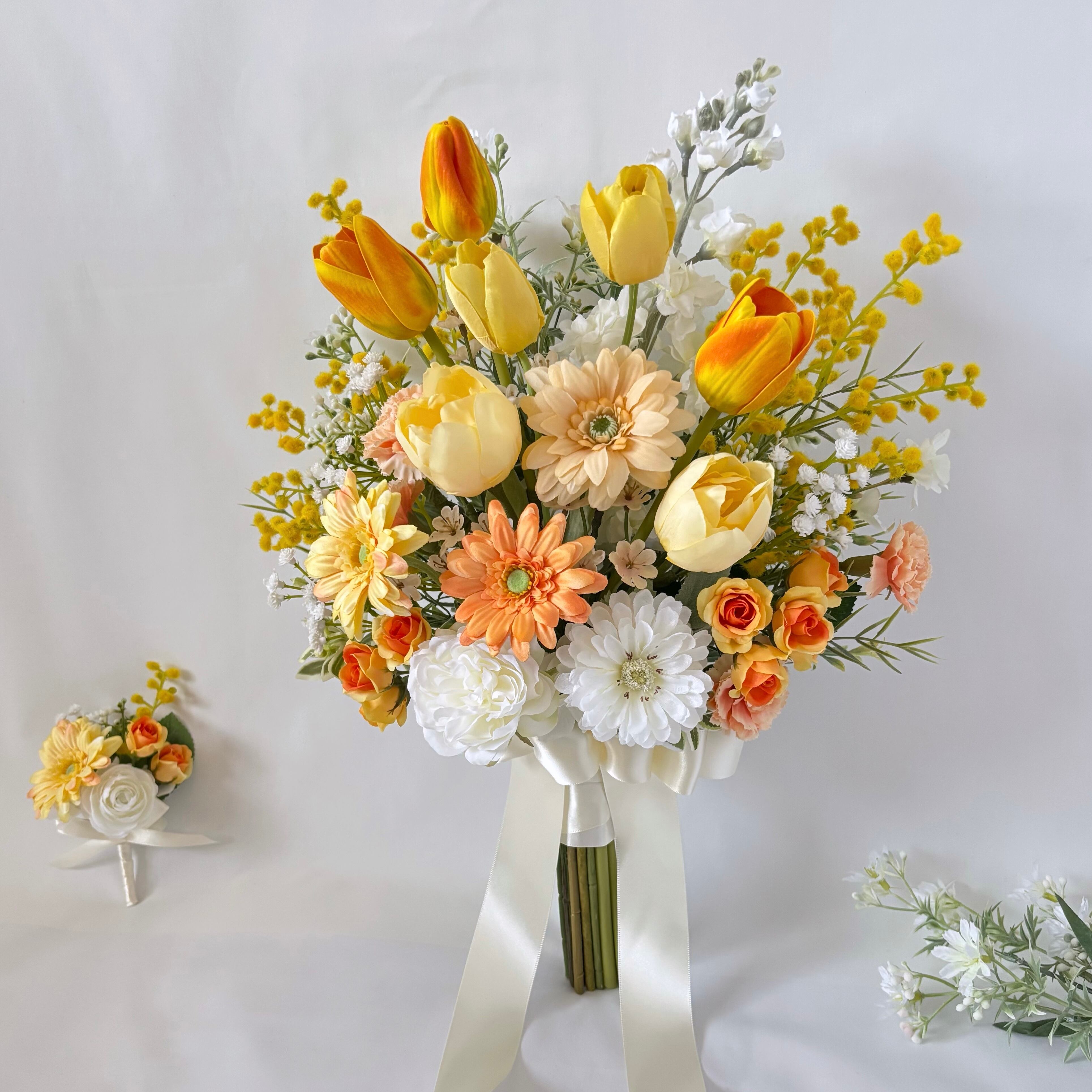 3種のガーベラとチューリップを使ったナチュラルなウェディングブーケです。