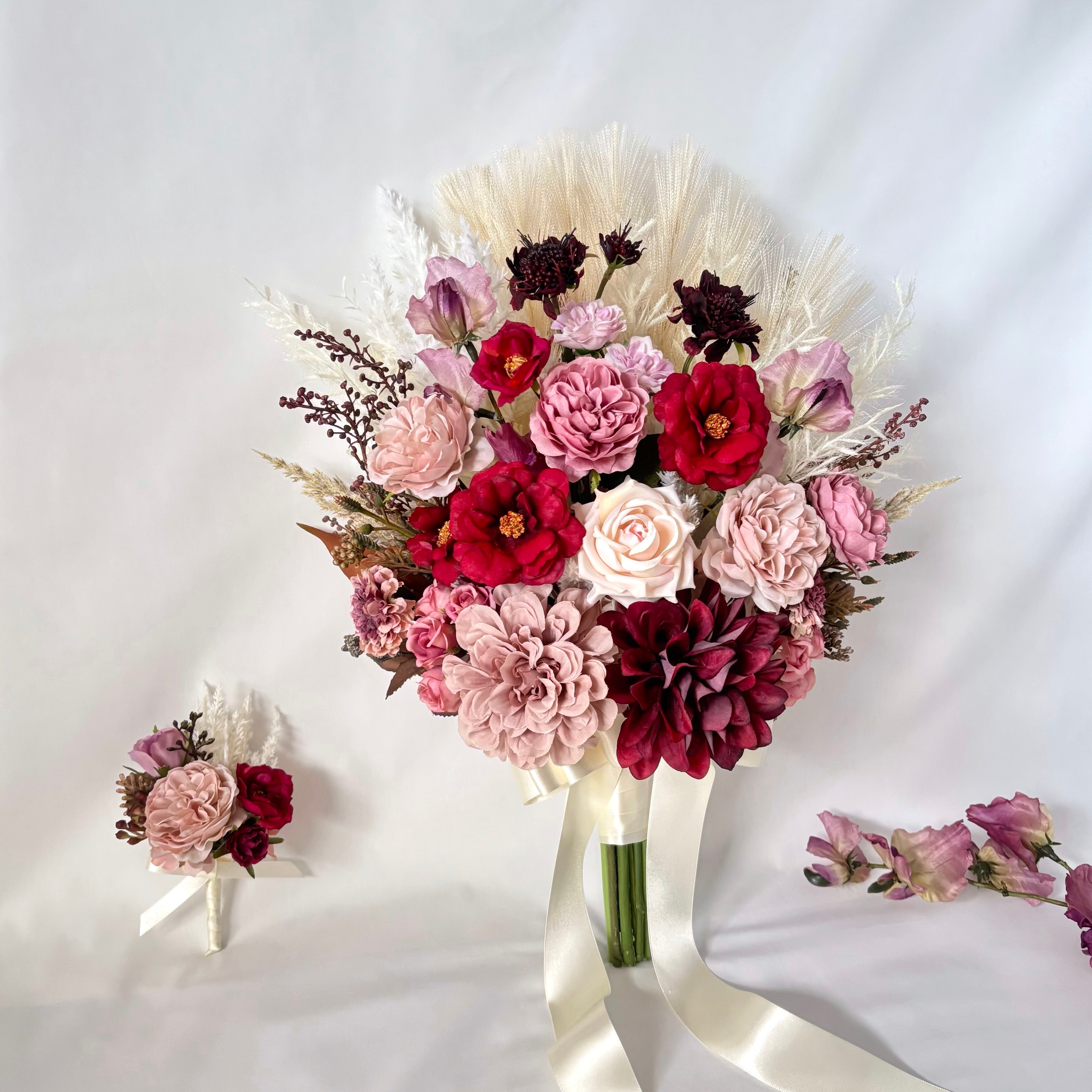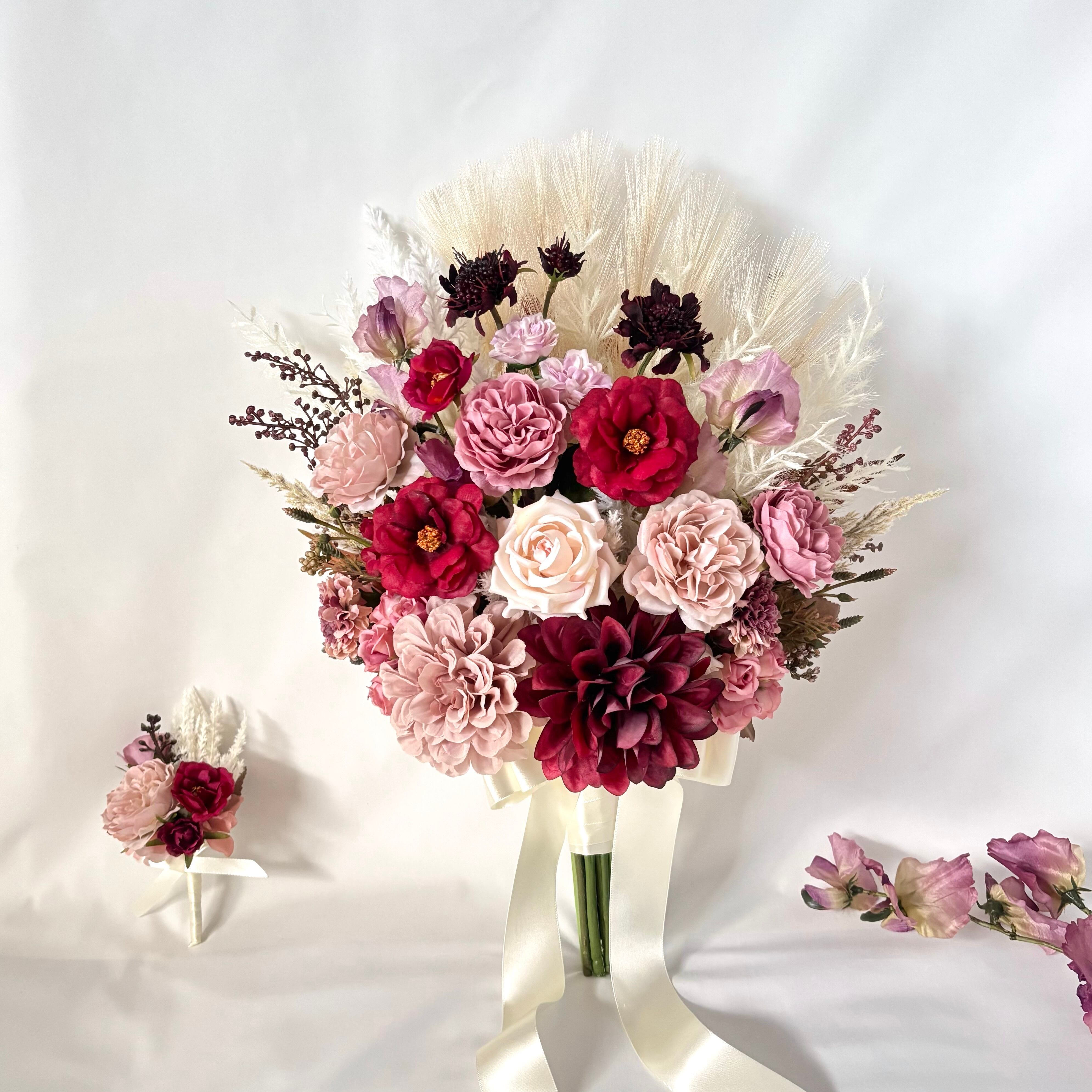 淡いくすみピンクとボルドーのダリア・ローズ・スイートピーなどを合わせています。