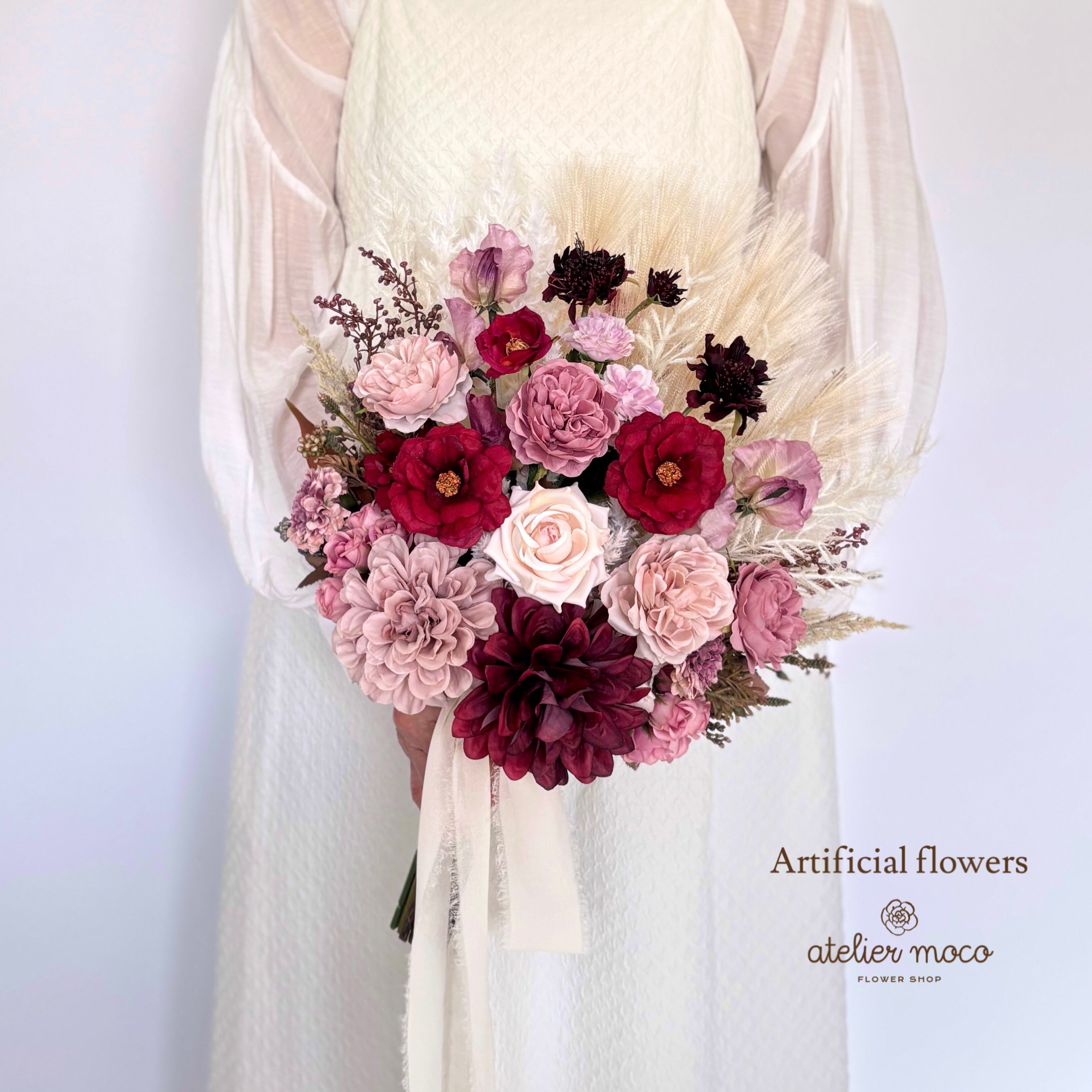 くすみピンク&ボルドー系のアンティークな色合いのウェディングブーケです。