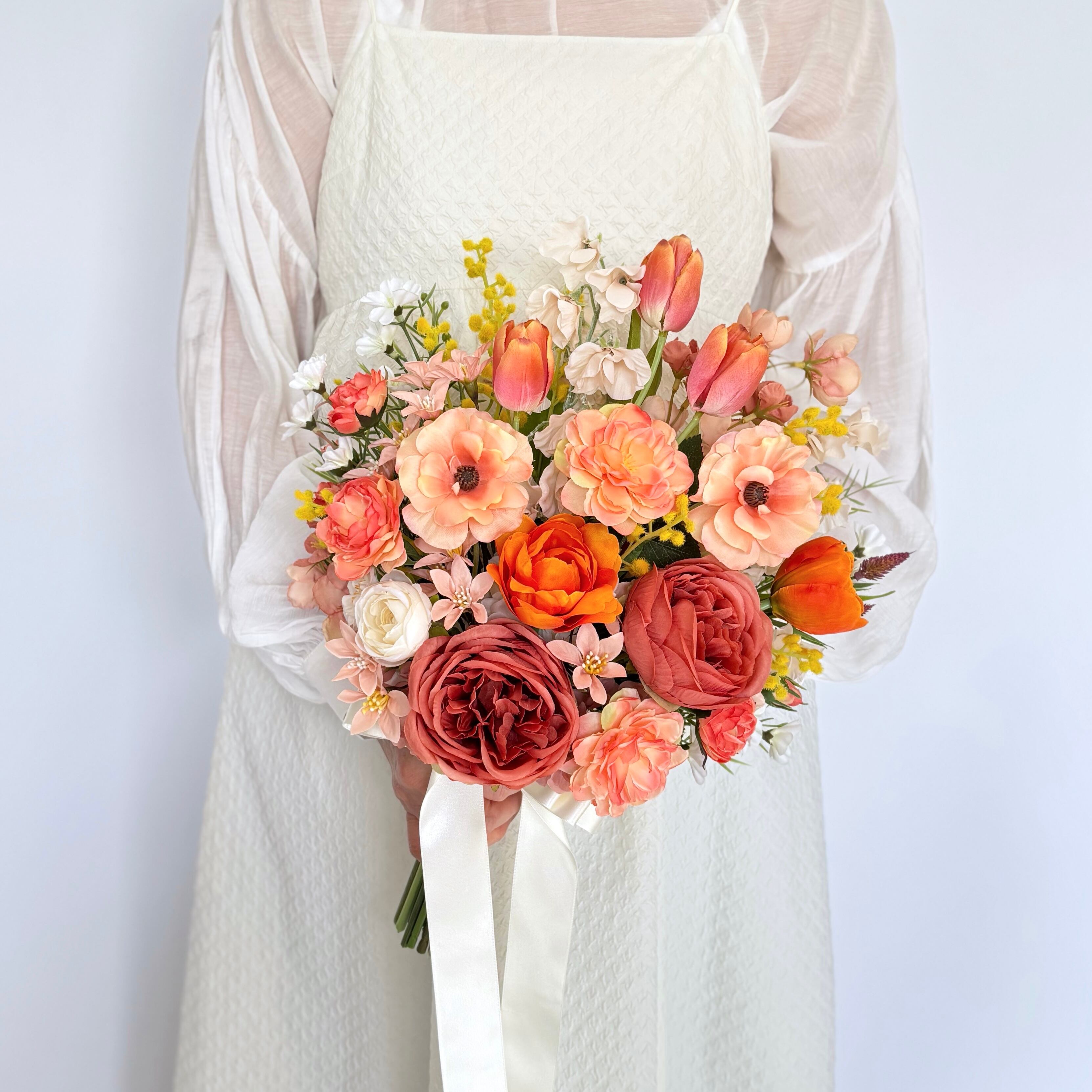 オレンジのチューリップ、ピーチベージュのラナンキュラス、ベージュのスイートピーなどを合わせ、あたたかな色味とレトロな風合いに。