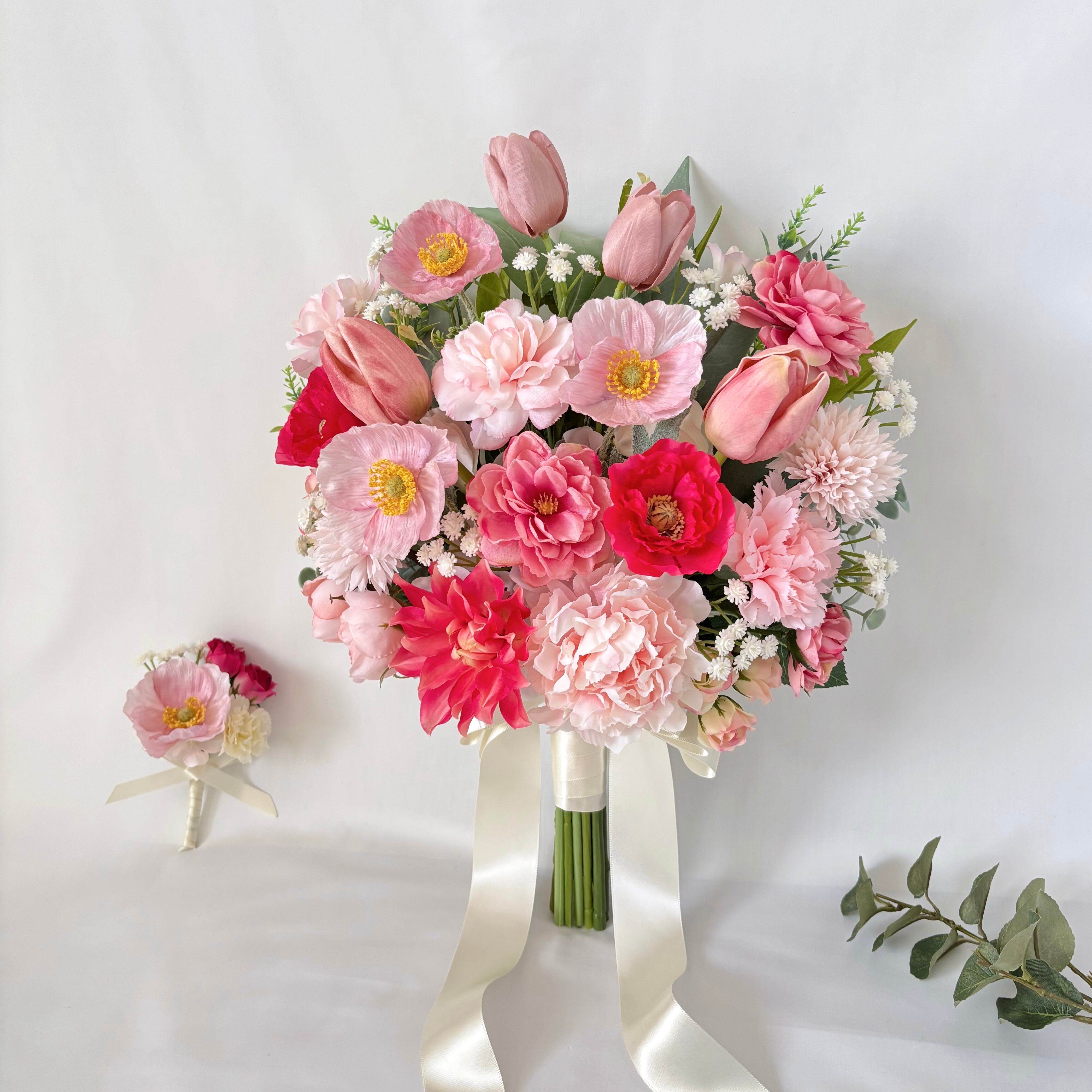 ピンクダリアとポピーのナチュラルクラッチブーケ