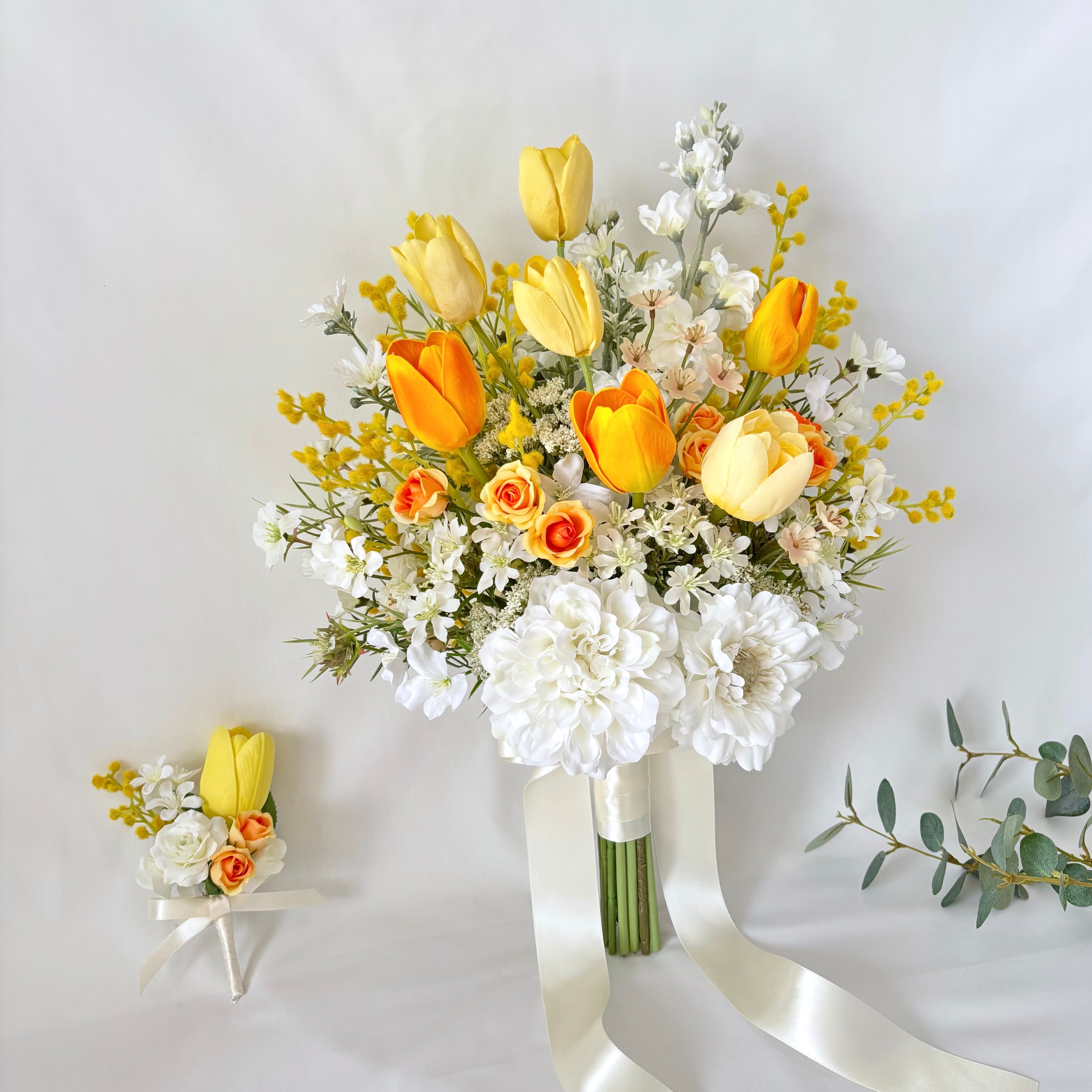 オレンジとイエローのチューリップをたっぷり使ったウェディングブーケです。
